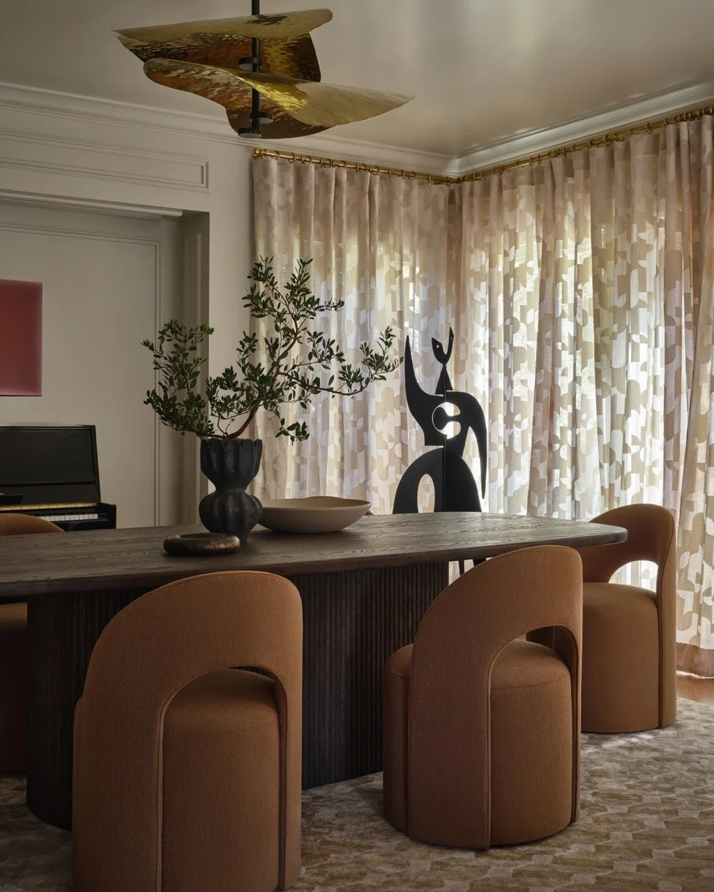 Exuding a captivating blend of moody sophistication and edgy refinement, Ashbury Terrace represents a comprehensive transformation of a craftsman home in San Francisco's historic Ashbury neighborhood, expertly orchestrated by Atelier Oleana. The homeowners – a young family and their black lab, Cala – commissioned Jain to transform the architectural bones of their primary residence into a space that artfully balances the husband's affinity for rich pattern and vibrant color with the wife's predilection for serene shades of blue. The resulting design brief called for a contemporary, sophisticated, and luxurious aesthetic infused with elements of British punk, brought to life through sumptuous materials including Dedar velvets and Pierre Frey silks, architectural statements such as a dramatic curved staircase and a sweeping wall of handcrafted built-ins with a custom ladder in the library, and provocative art pieces that command contemplation – including Katherine Gray's sculptural works sourced from The Future Perfect, an Aldo Chaparro stainless steel sculpture that sits atop the living room's striking Sahara Bronze fireplace, and a freestanding figure by Antoine de Saint Pierre that became the conceptual anchor for the entire dining room design.